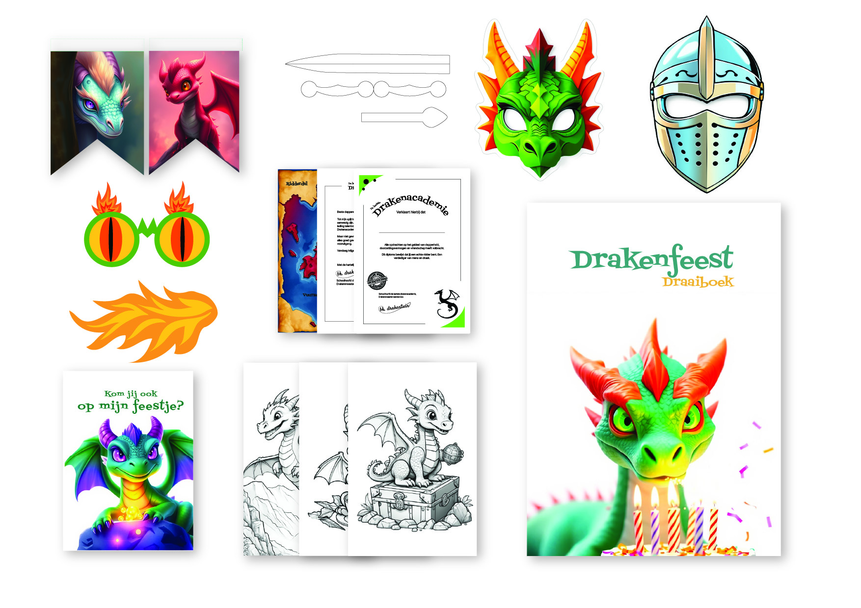 Om het huis alvast een beetje gezellig aan te kleden krijg je bij dit drakenfeestje alvast vlaggetjes, een poster, maskers, kleurplaten en een template voor een drakenzwaard. Ook krijg je een drakendiploma voor alle kinderen.